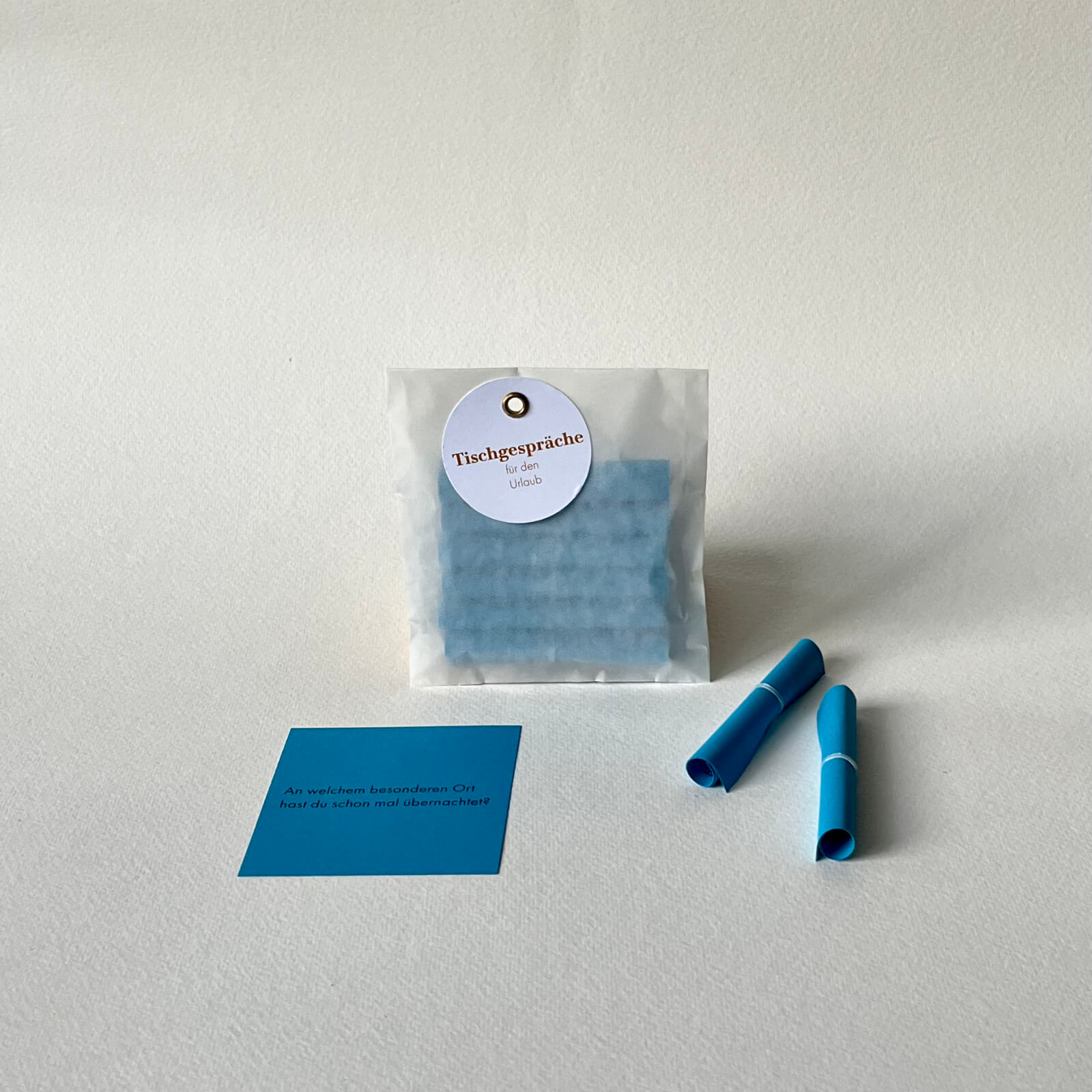 Six questions as paper rolls, packed in an elegant glassine bag, closed with a golden eyelet.