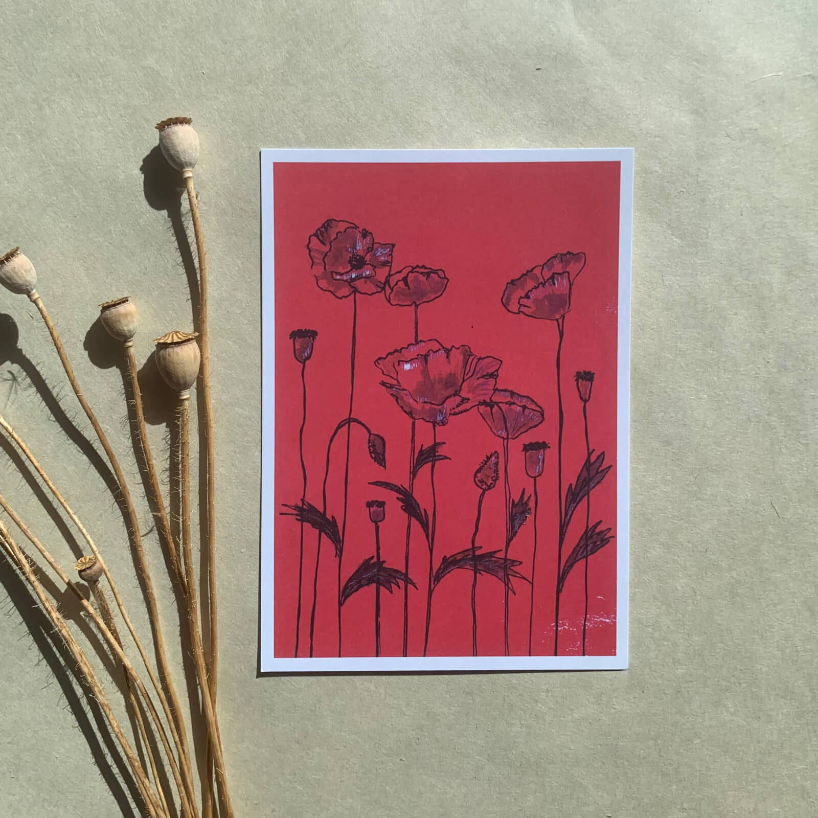 Die Motive der Postkartenserie Tusche sind mit zarten Zeichnungen auf handgedruckten farbkräftigen Hintergründen illustriert. Die dargestellten Zweige und Blüten wirken sehr plakativ und sind daher besonders dekorativ.