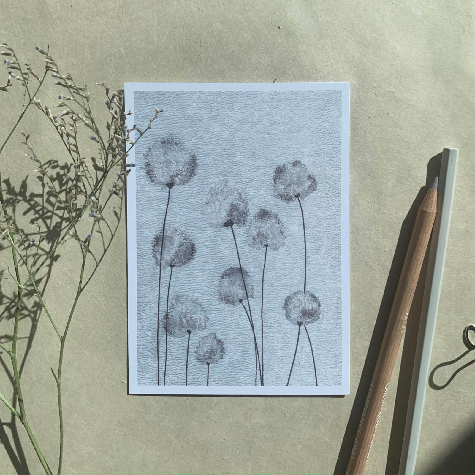 Die Motive der Postkartenserie Tusche sind mit zarten Zeichnungen auf handgedruckten farbkräftigen Hintergründen illustriert. Die dargestellten Zweige und Blüten wirken sehr plakativ und sind daher besonders dekorativ.
