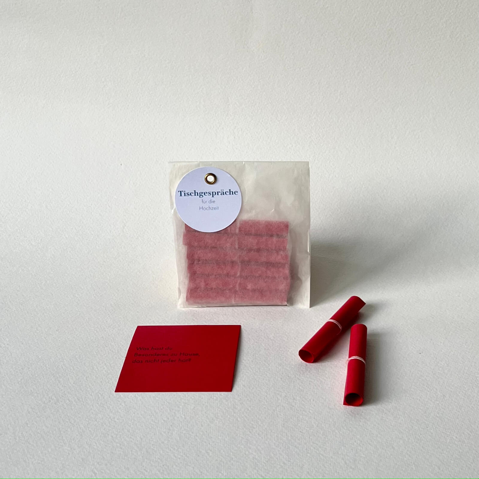 Sechs Fragen als Papierröllchen, verpackt im edlen Pergaminbeutel, verschlossen mit goldener Öse.