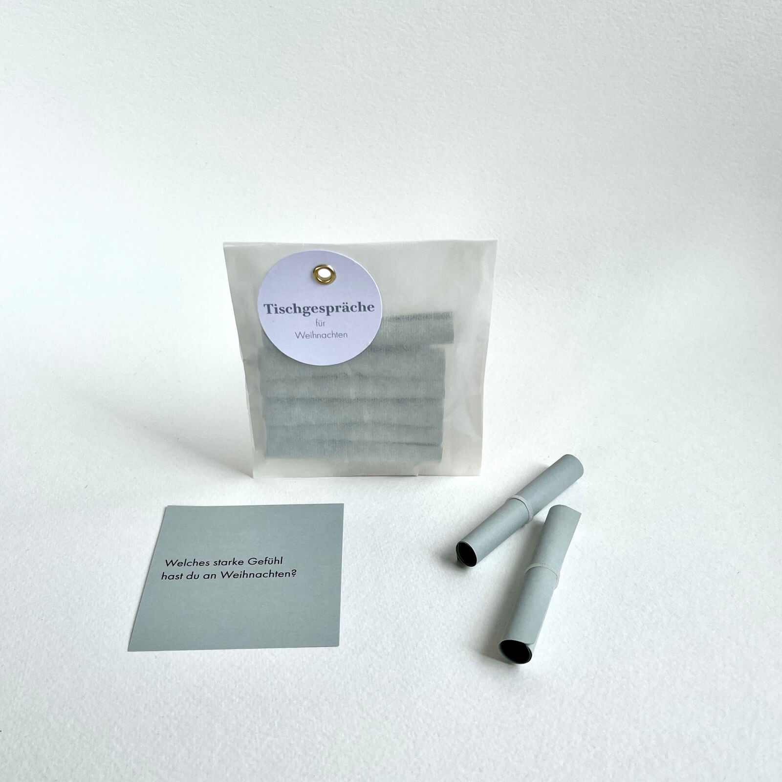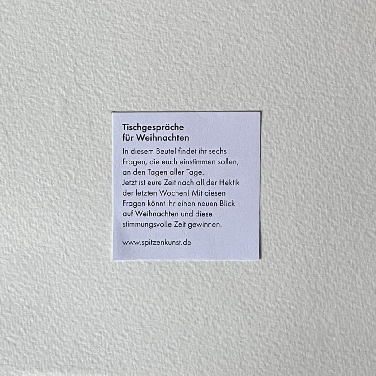 In diesem Beutel findet ihr sechs Fragen, mit denen ihr an Weihnachten die Hektik der vergangenen Tage verdauen könnt. Ein besonderes Geschenk für das Treffen an Weihnachten das hilft, einen anderen Blick auf dieses Fest zu werfen und sich Zeit füreinander zu nehmen.